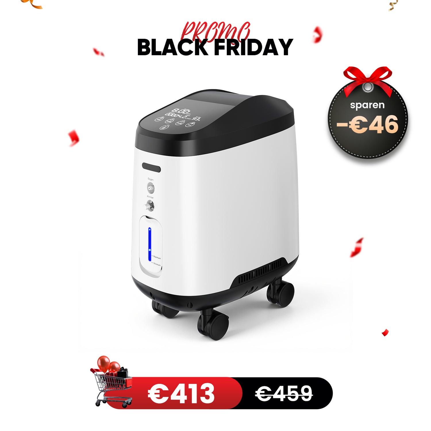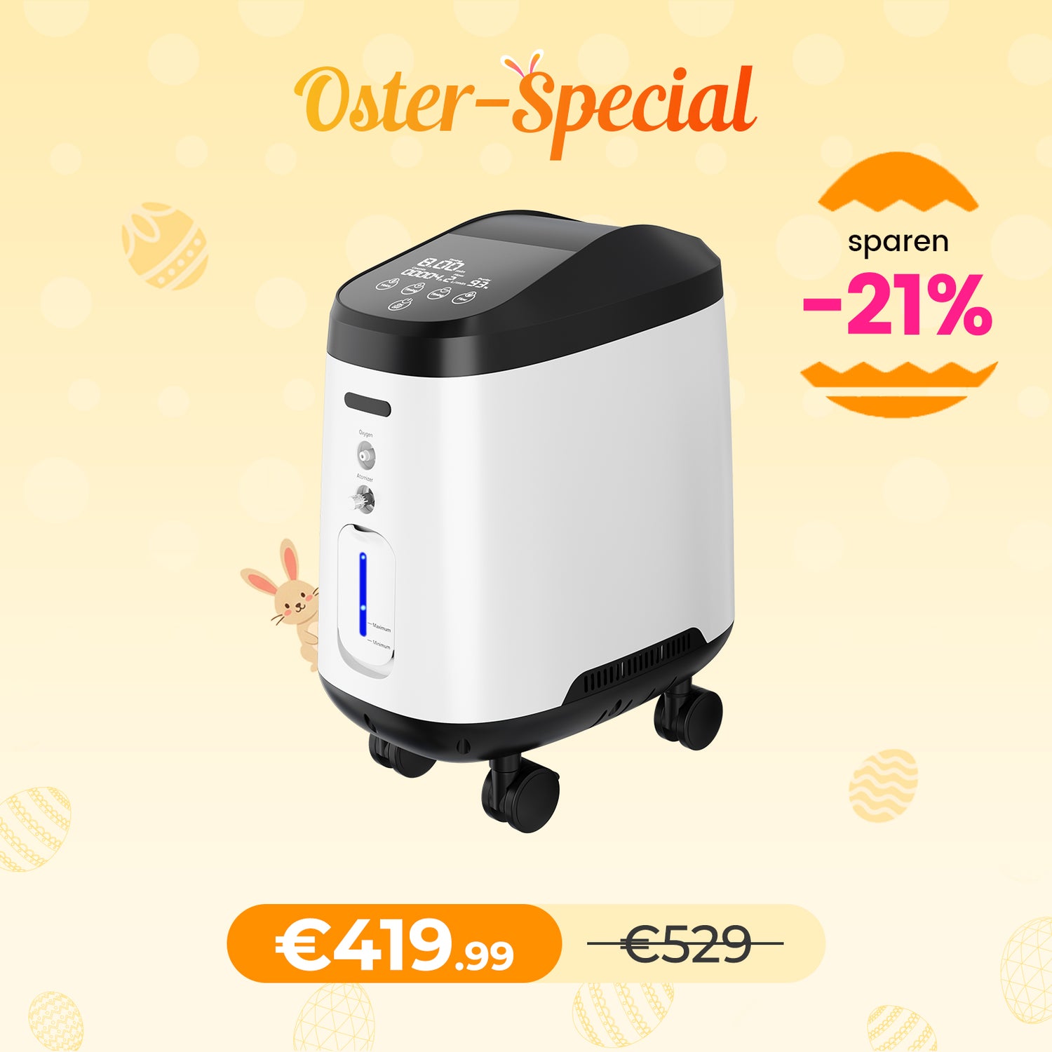Der Sauerstoffkonzentrator verfügt über einen einstellbaren Sauerstofffluss von 1–9 l/min. Je niedriger der Sauerstofffluss, desto höher die Sauerstoffkonzentration. Bei einem Sauerstofffluss von 1–2 l/min erreicht die Sauerstoffkonzentration 93 ± 3 %. Das Sauerstoffgerät verfügt über eine abnehmbare, integrierte Befeuchtungsflasche, die den eingeatmeten Sauerstoff für mehr Komfort befeuchtet.