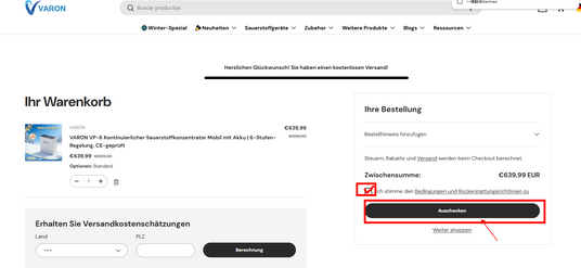 Aktivieren Sie das Kästchen „Ich stimme den AGB und der Rückgaberichtlinie zu“ und klicken Sie dann auf „Zur Kasse“ (Auschecken).