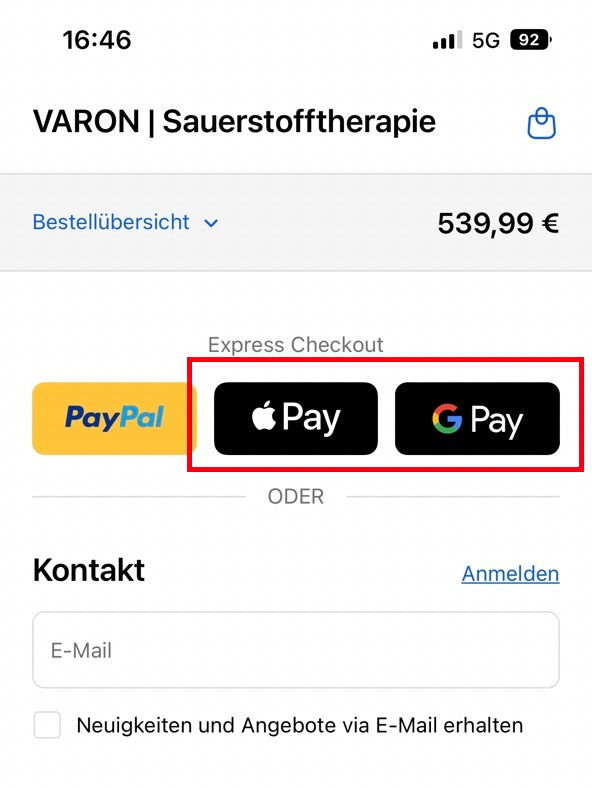 Tipp: Sie müssen Google Pay oder Apple Pay vorab auf Ihrem Gerät eingerichtet und mit einer Zahlungsmethode verknüpft haben.