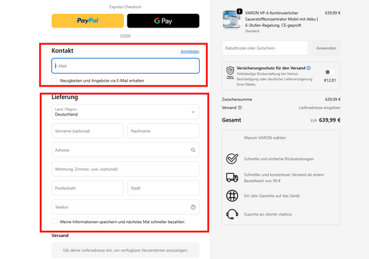 Bitte geben Sie zuerst Ihre E‑Mail‑Adresse (für die Bestellbestätigung) und Ihre vollständige Lieferadresse ein. So stellen wir sicher, dass Ihre BesWählen Sie anschließend Ihre bevorzugte Zahlungsart (z.B. Kreditkarte, PayPal, Klarna) aus der Liste aus.tellung korrekt zu Ihnen kommt.