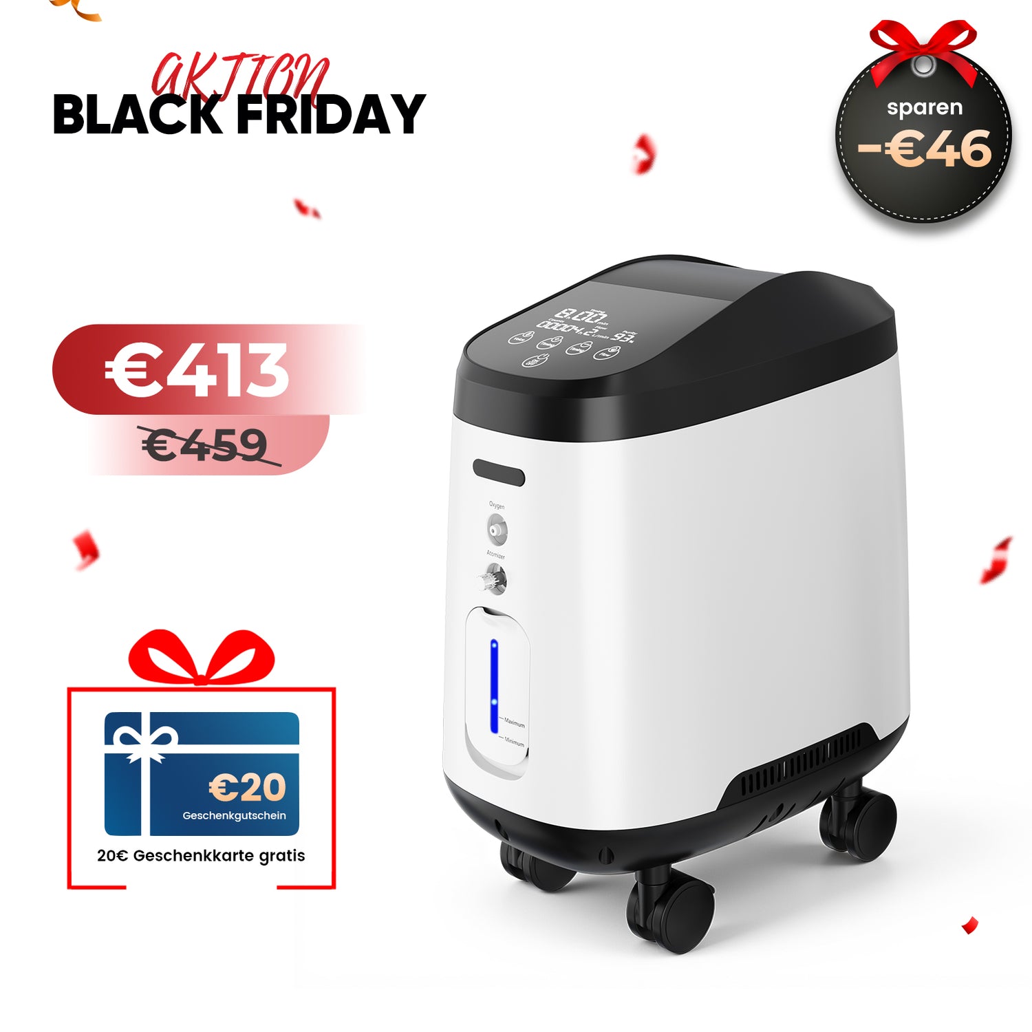 Der Sauerstoffkonzentrator verfügt über einen einstellbaren Sauerstofffluss von 1–9 l/min. Je niedriger der Sauerstofffluss, desto höher die Sauerstoffkonzentration. Bei einem Sauerstofffluss von 1–2 l/min erreicht die Sauerstoffkonzentration 93 ± 3 %. Das Sauerstoffgerät verfügt über eine abnehmbare, integrierte Befeuchtungsflasche, die den eingeatmeten Sauerstoff für mehr Komfort befeuchtet.